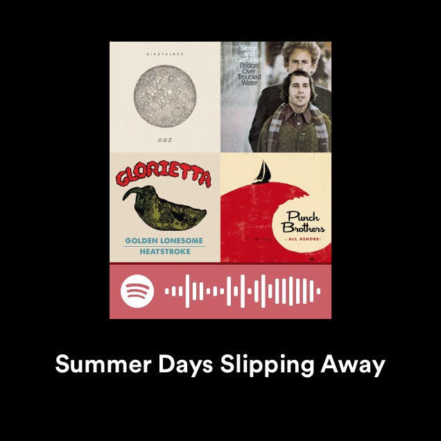 Well there you have it! I hope you all had a great summer, and discovered some new tunes along the way. And since I dropped off the radar for a minute, I’ve decided to also curate an End of Summer playlist for you all. Late August/early September always feels like a season, between seasons for me. The days are still sunbaked and speckled with late blooming wildflowers and sage. Then the nights are crisp and cool, scented by neighborhood fire places; and I find myself waiting anxiously for those blustery October days and songs that fit the gloomy mood. So this playlist is a mix of just that! I hope you all enjoy! Click the picture below and it will take you to the playlist.